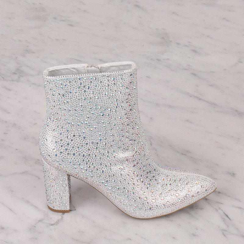 Description Women's Booties Rhinestone Embellished Pointed Toe Side Zipper Heel height is approx. "3.5"