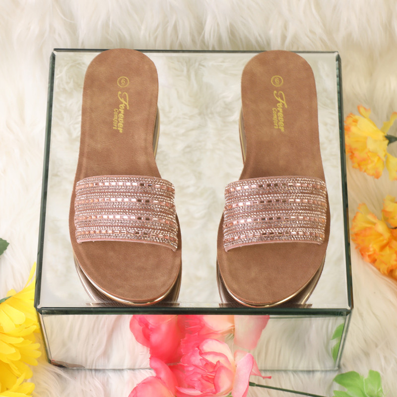 Description Woman Sandals Open Toe Slip On One Strap Rhinestone Embellished Flat Heel Round Toe Everyday Wear