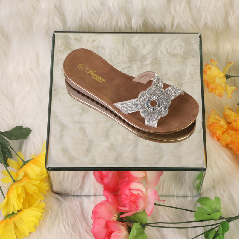 • One Strap Rhinestone Embellished Floral Design Flat Heel Round Toe